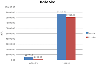 There's no surprise that nologging option generates the lowest amount of redo. The logging test case generated around 83-84MB of redo for insert and update which is roughly the same size as the LOB inserted/updated (800KB x 100). There's minimal logging during the nologging test. Since redo is counted for the entire test, the redo seen could be the redo generated for the table data insert (as oppose to lobs) which still is on a tablespace with logging. Nevertheless a clear difference could be observed in the amount of redo generated when nologging is used. This is also reflected in the log file sync time for the two test cases which got reduced from several minutes to under a minute.