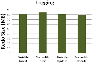 Comparing redo size and log file sync time for nologging option between the basicfile and securefile shows a mix bag of results. Basicfile has performed well for inserts in reducing redo generated and log file sync while securefile performed well for updates.