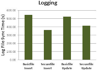 Comparing the IO types on OEM console during the nologging test it was noted that securefile uses predominantly large writes while the basicfile uses small writes. Comparing the test result with logging enabled the securefile out performance basic file for insert and updates in terms of log file sync wait time. Both securefile and basicfile generates roughly the same amount of redo. It must be noted nocache logging is the default for secure file. The table below shows all the test results.